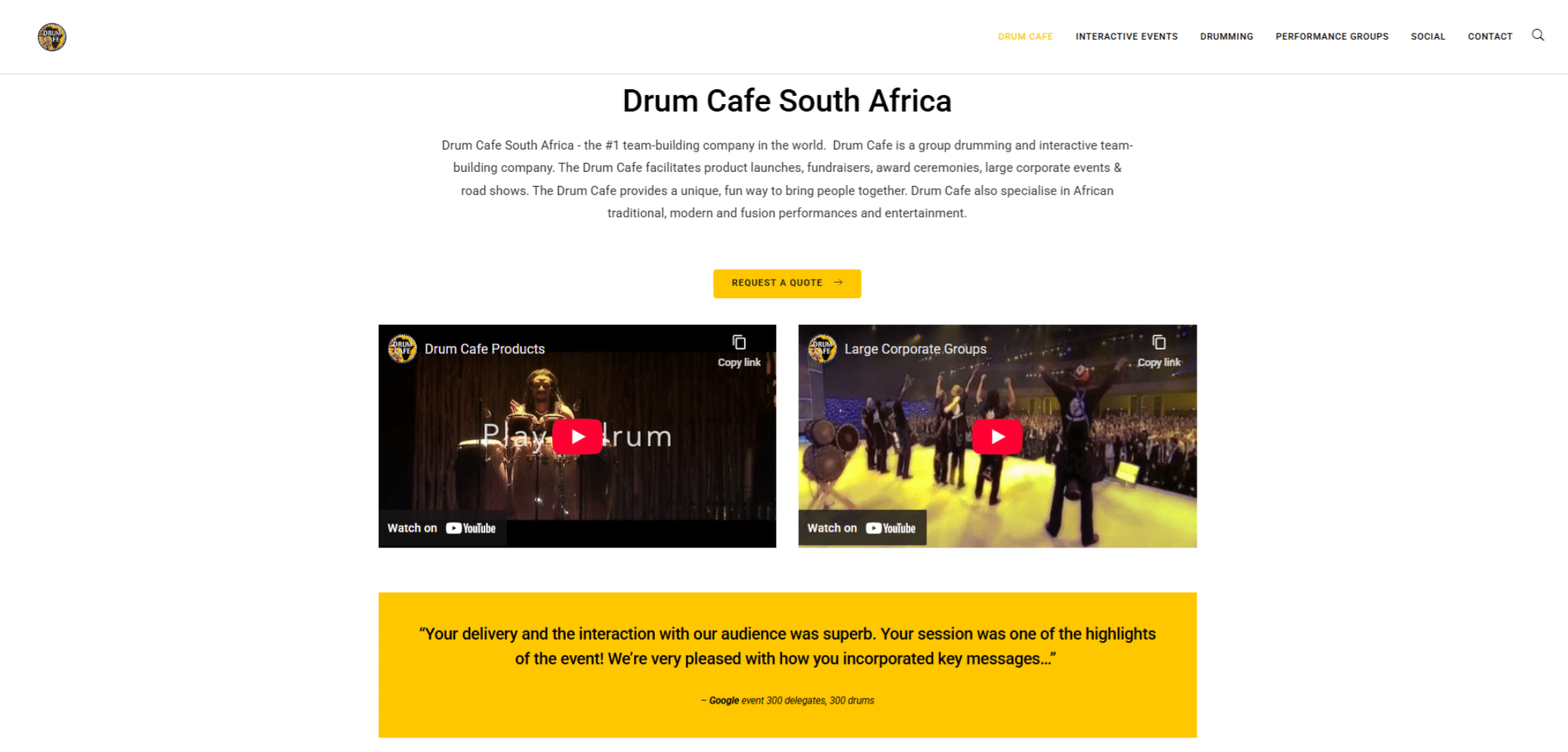 Drum Cafe South Africa — a global leader in interactive drumming events, team-building workshops, and corporate activations — approached us to modernise their existing website. With over 25 years of experience in the industry, the brand had built a strong reputation, but their original static HTML site no longer met modern usability, accessibility, or mobile expectations.